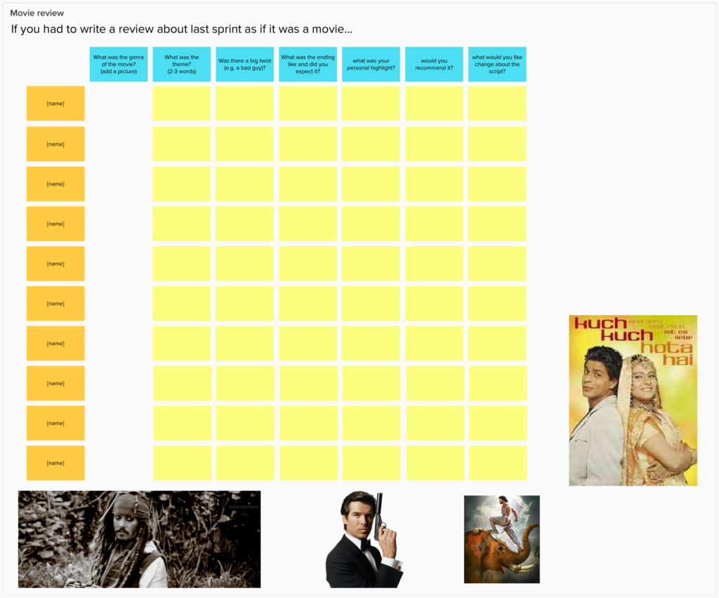 - Discuss the answers with each other. Since this retrospective format can give a lot of diversity in the answers the skill here is to find the 1) general feeling and 2) the big diverse. As an example, if one person says the sprint was a love story and the other one a horror that is interesting to explore. If you give everyone a turn this can take hours. During the retrospective we’re ofcourse looking for ways to improve ourselves therefore in this format it is useful to ask people that would like to change something; that wouldn’t advise this sprint or that learned a lot or less to see how they can work towards a better movie next time.